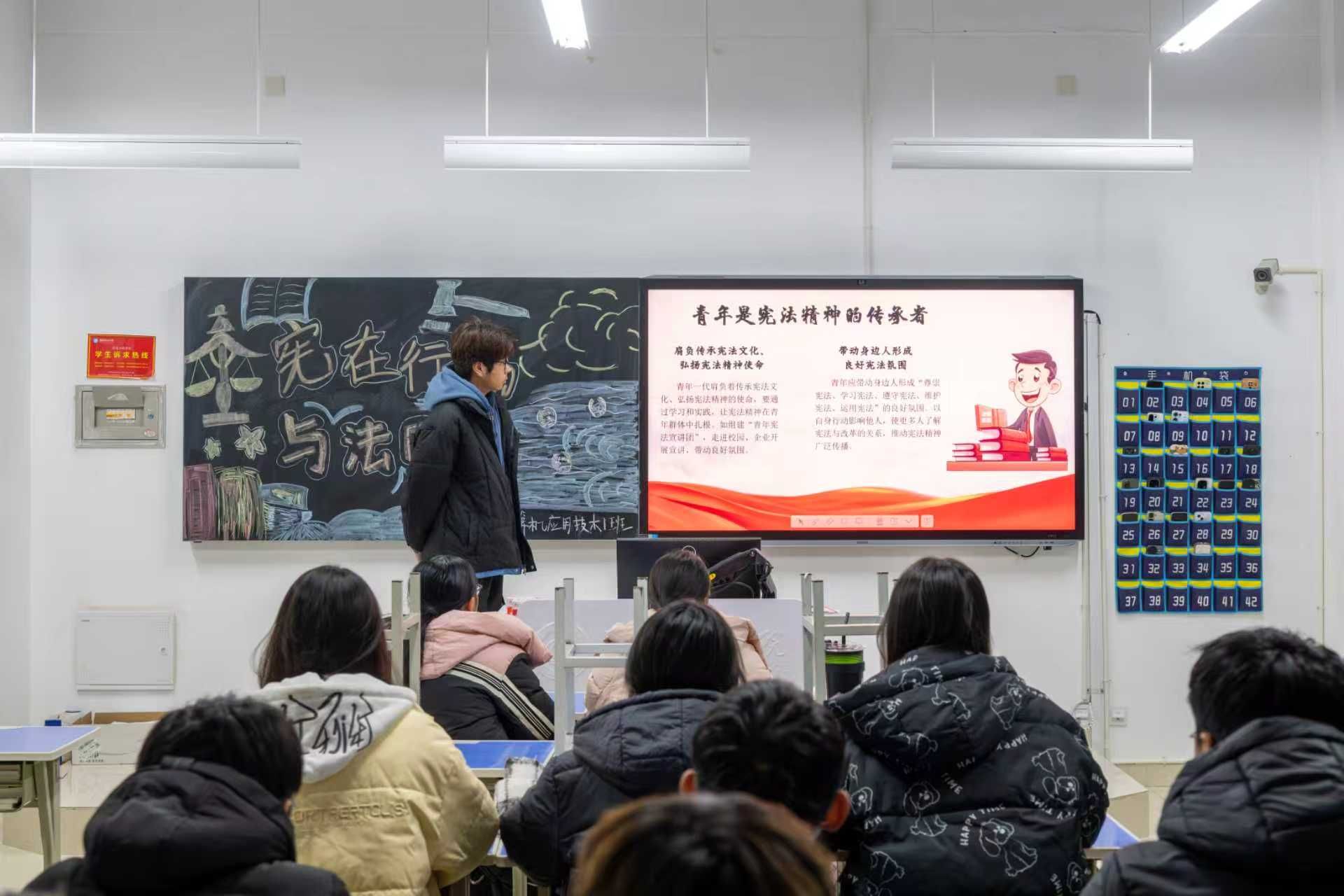 团课现场,学生干部以宪法发展历程为主线,紧密结合当代改革实践中的生动案例,深入浅出地剖析了宪法精神对个人成长成才与社会进步发展的核心价值。同时,围绕“宪法精神如何融入日常生活”这一关键问题,分享了具体可行的实践策略,引导同学们将法治理念内化为行为准则,树立坚定的法治信仰。课程期间,同学们全神贯注聆听宪法解读,积极参与互动研讨,围绕“如何将宪法原则转化为实际行动”展开交流,在思想碰撞中深化了对“知行合一”的理解。通过互动交流,大家深刻领悟到尊崇宪法、维护法治不仅是公民应尽的责任,更是推动社会和谐、促进国家发展的基石。