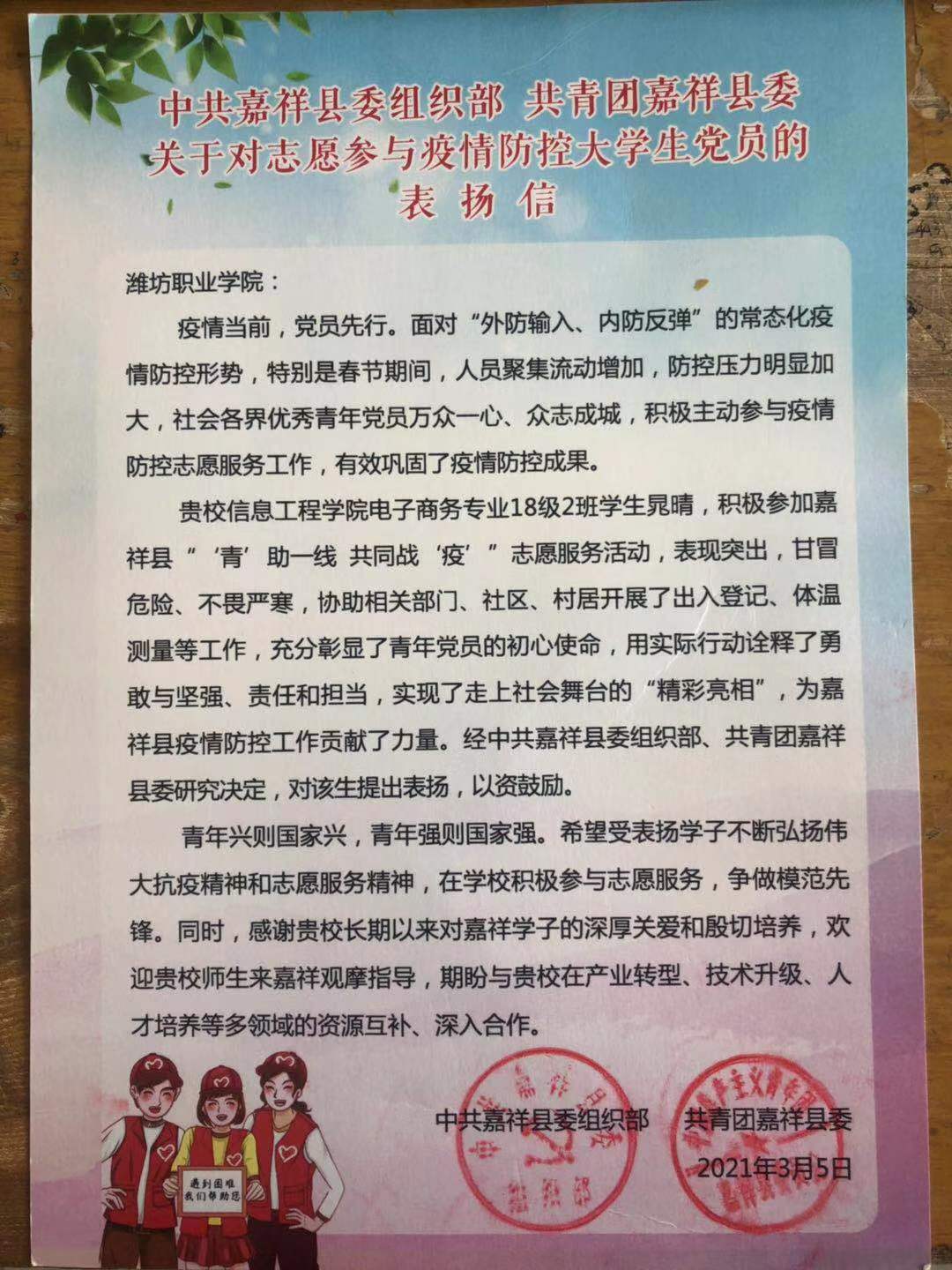 近日,必威BETWAY西汉姆联团总支收到中共嘉祥县委组织部、共青团嘉祥县委送来的一封感谢信,感谢我院2018级电子商务2班晁晴同学在春节期间积极主动参加疫情防控志愿服务工作。一封感谢信,不仅是潍职学子在用实际行动诠释勇敢与坚强、责任与担当,更是“崇实尚行 敢于争先”潍职精神的体现。