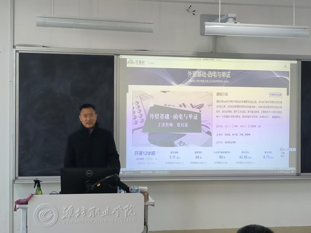 张启途老师以自己的职业教育国家精品在线开放课程《外贸基础——函电与单证》为例,结合长期的教学实践和在线精品课程建设经验,从总体要求切入,围绕什么是精品在线课程、如何建设在线精品课程、如何提高申报获批率三个方面进行了深入浅出的阐述与讲解。同时结合申报材料,详细介绍了撰写课程申报书、制作视频以及整理各类附件材料的注意事项,并针对在线精品课程设计与制作方法中的常见问题进行系统讲解,使老师们对在线精品课程的认定政策及要求、设计理念和策略、建设方向和路径、申报书的撰写以及申报流程有了更为深入的了解和认识。讲座结束后,张启途老师与该院教师进行了探讨交流。整个讲座内容丰富,具有很强的实用性,老师们认真倾听、详实记录,为后续在线精品课程建设奠定了基础。