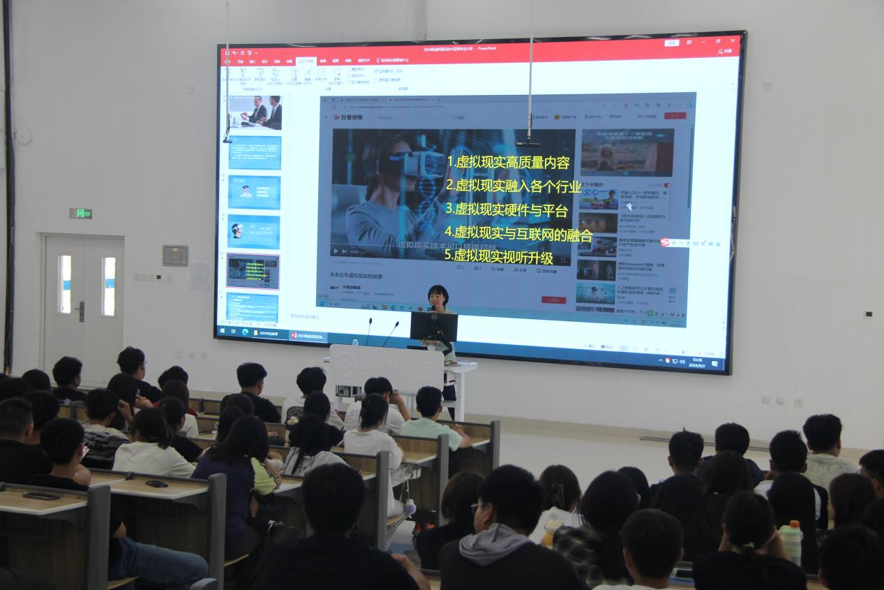 专业负责人以当下热门游戏《黑神话:悟空》中所运用的虚拟现实技术为切入点,成功勾起了学生们强烈的探究兴趣,由此展开了专业感知教育。随后,从专业发展前景、培养目标、专业特色、课程体系、实践应用以及前沿技术等多个维度对专业进行了详尽的介绍,为新生们打开了一扇通往专业知识殿堂的大门,使他们对所学专业有了更为清晰的认识。鼓励新生转变学习思维,化被动为主动,积极开展专业延伸学习,极大地激发了同学们的学习兴趣与探索热情。最后,带领新生对实训场所和专业工作室进行了实地参观体验,让他们亲身感受专业学习的实训环境及实际应用场景。