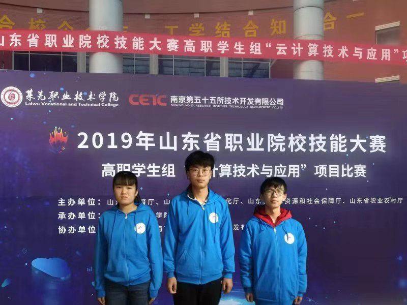 近日,山东省职业院校技能大赛高职组“云计算技术与应用”比赛在莱芜职业技术学院举行,来自全省高职院校的35支代表队参加了比赛。我院派出2018级计算机网络技术专业的刘世亚、赵圣泽、王悦3位同学组队参加了本次比赛。参赛队员沉着冷静、分工合理、配合默契,经过4个小时的激烈角逐,获得了团体二等奖。